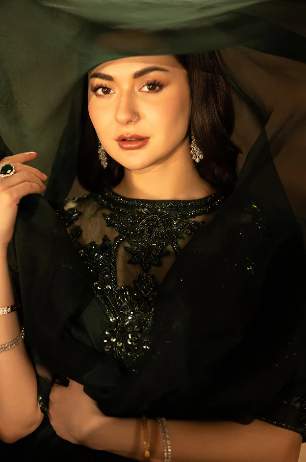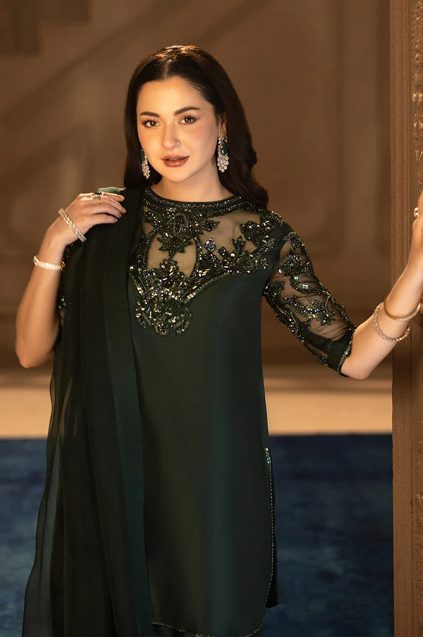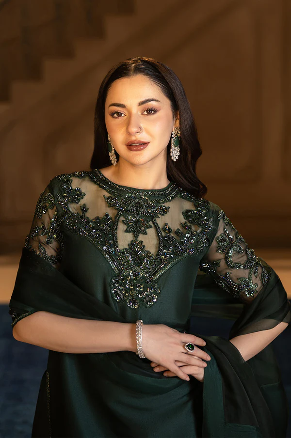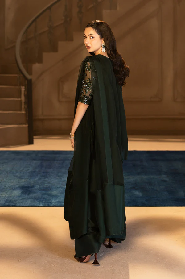 This elegant Emerald Muse 3-piece outfit is a perfect blend of sophistication and modern charm. The shirt features intricate tonal embroidery across the neckline and sheer sleeves, creating a rich, luxurious texture that immediately draws attention.The flowy trousers offer a relaxed yet polished silhouette, ensuring comfort without compromising on style. A matching dupatta completes the look with effortless grace, adding movement and depth to the ensemble.