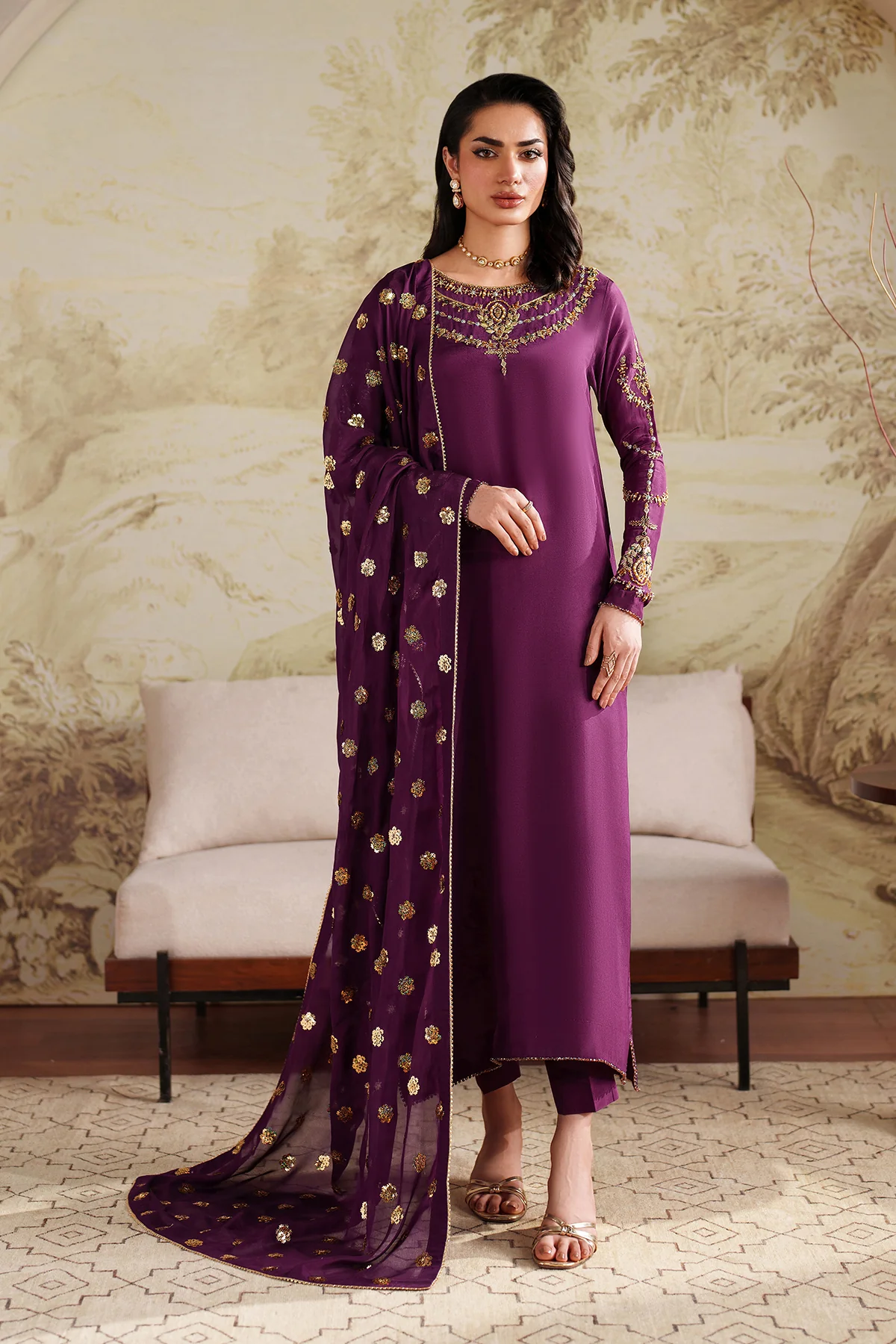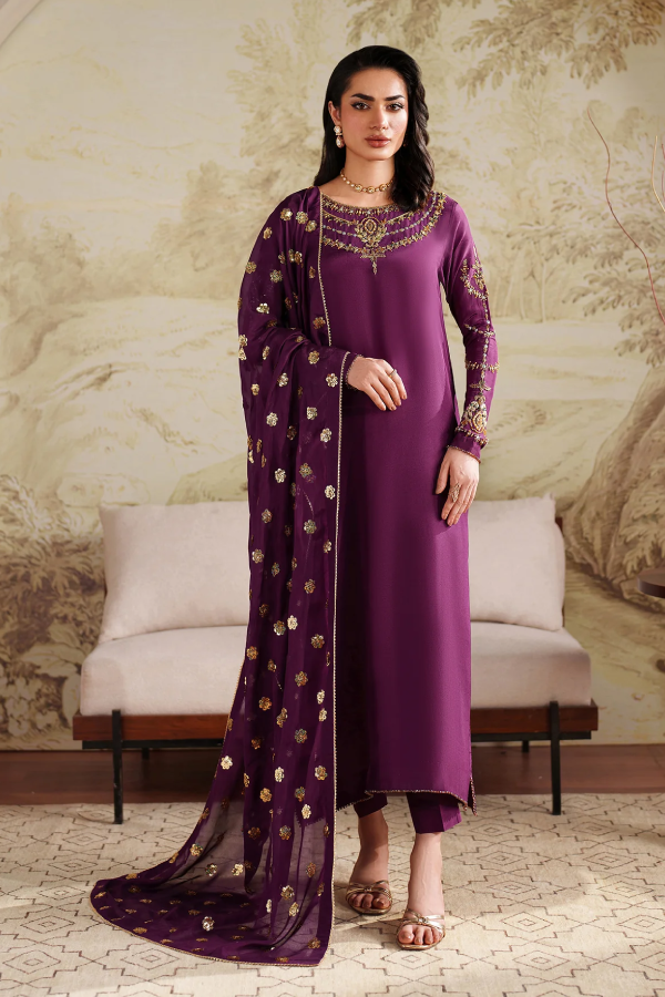 This Plum Luxe embroidered 3-piece outfit exudes elegance and regal charm. Crafted in a deep, luxurious plum shade, the long shirt features intricate gold embroidery around the neckline and sleeves, creating a striking contrast that feels refined and graceful. The clean, straight silhouette offers a flattering fit while maintaining a timeless appeal. Paired with matching trousers, the ensemble looks polished and sophisticated. The sheer dupatta, adorned with delicate gold motifs and a fine border, adds a touch of glamour and movement, completing the look beautifully.